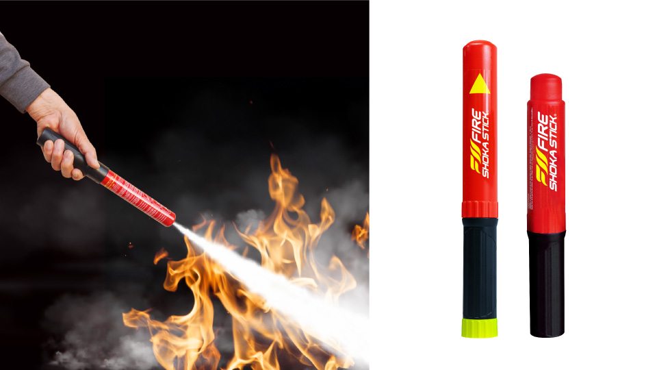 ファイヤーショーカスティックが軽量コンパクトで、かつ、消火対応後に環境を汚してしまう残留物を出さないことが、真っ白な粉だらけになる消火器のイメージを一新し、より身近な道具として進化している。と評価されました。